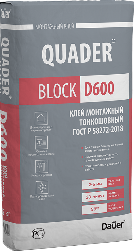 РЕКОМЕНДАЦИИ В процессе работы и при твердении температура окружающей среды и основания должна быть не ниже +5 °С. Принудительный нагрев и сушка твердеющей поверхности кладки не допускаются. Необходимо исключить преждевременное высыхание поверхности кладки, не допускать попадания прямых солнечных лучей, осадков и воздействия сквозняков. При их наличии, обеспечить закрытый контур строительного помещения, либо произвести монтаж защитных тентов в зоне проведения работ. При проведении кладочных работ при низких (ниже +5 °С) и отрицательных температурах необходимо использовать зимнюю версию QUADER BLOCK D600. Не допускается совместное применение с материалами, содержащими гипс. Все технические характеристики верны при температуре окружающей среды +20 °С и относительной влажности не менее 60 %. При работе с материалом следует руководствоваться инструкциями по ведению общестроительных работ и технике безопасности в строительстве. При подготовке основания и проведении отделочных работ необходимо соблюдать все требования актуальных редакций СП (в т.ч. СП 70.13330, СП 15.13330). При возникновении вопросов, обращайтесь к Производителю. Инструкция по применению, указанная на упаковке, теряет силу после размещения новой редакции текста на сайте Производителя, который указан на упаковке.